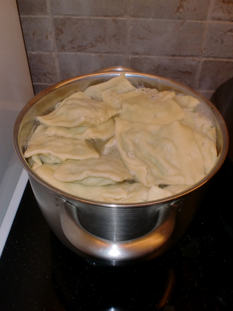De første pastaputene jeg lagde med raviolidelen ble mildt sagt ikke spesielt fine. Som Kristin ganske riktig påpekte, så var de nok litt for tynne i utførelsen, og falt derfor helt fra hverandre når vi skulle forsøke å legge de i kokevannet.