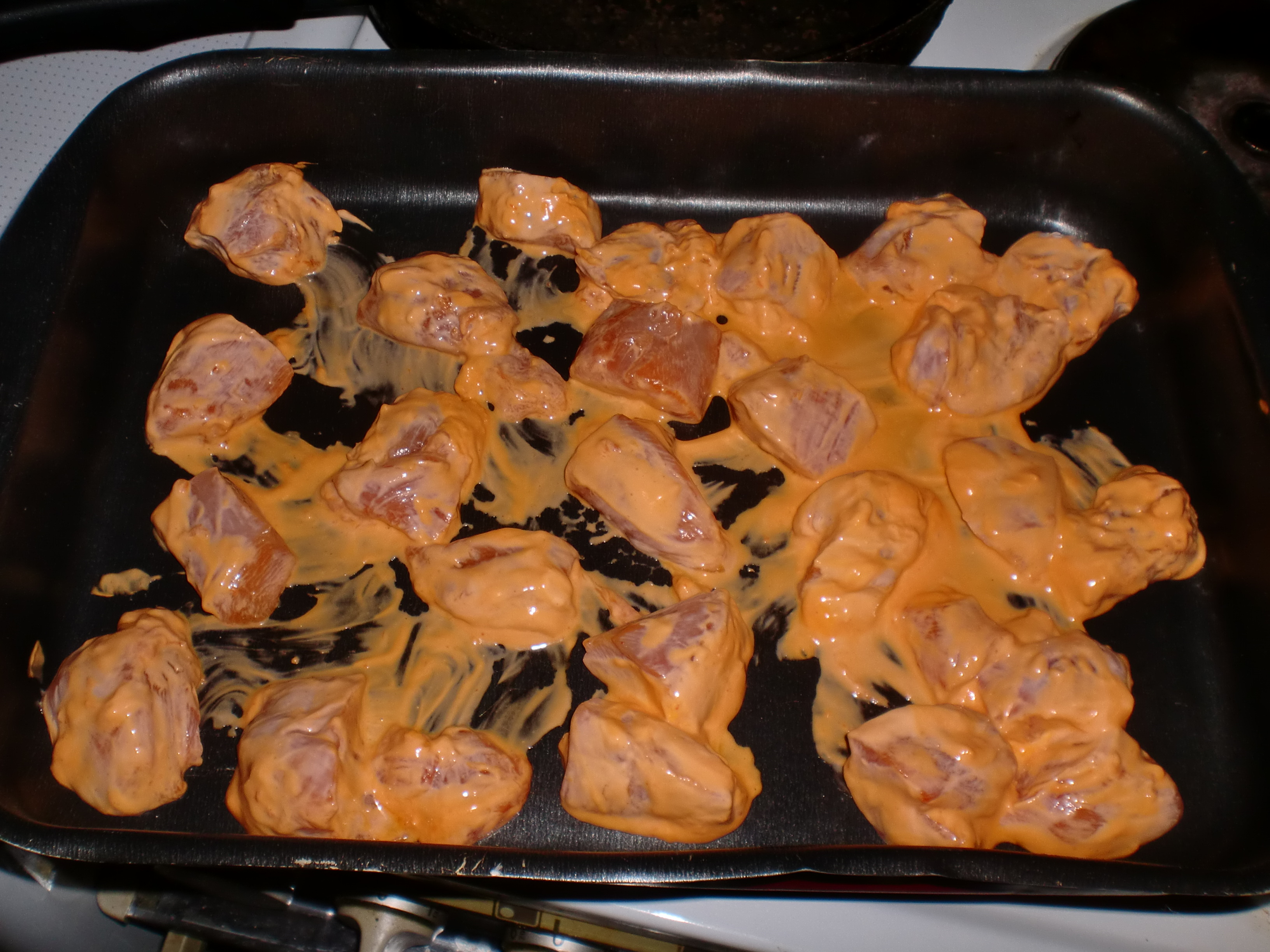 Like før du skal røre disse kyllingbitene inn i chiken tikka-miksen du lager steg 4, varmer du ovnen til maks temperatur og setter brettet med bitene inn øverst. Grill til bitene har fått litt farge og er gjennomstekt.