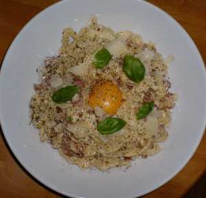 Ville jeg ha servert dette til Hellstrøm?: Jeg har lest at han synes pasta er oppskrytt, og siden jeg i tillegg brukte bacon fra Kiwi og ikke panchetta fra Jacobs fra Holtet, tror jeg han ville ha rynket på nesen.