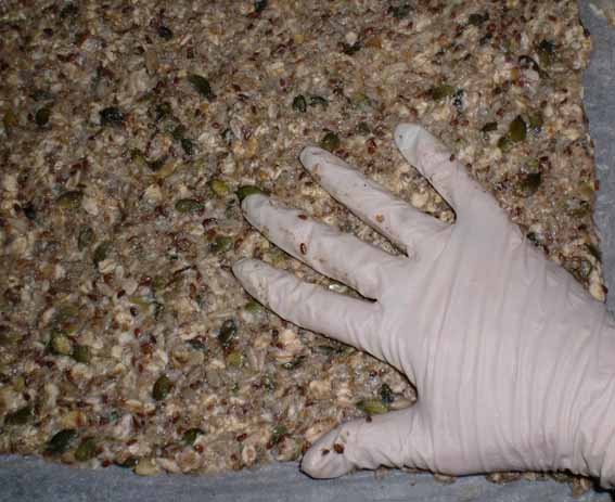 3,5 dl varmt vann helles over frø- og melblandingen og røres sammen med en skje. La dette stå en god stund og godgjøre seg før du fordeler denne klissete blandingen på et stekebrett med bakepapir på. Jeg brukte hendene til denne jobben. Hadde på et par latekshansker (100 kroner for 100 stykk på apoteket) og klappet de fint utover. Dryss gjerne litt maldonsalt på toppen for en ekstra piff.