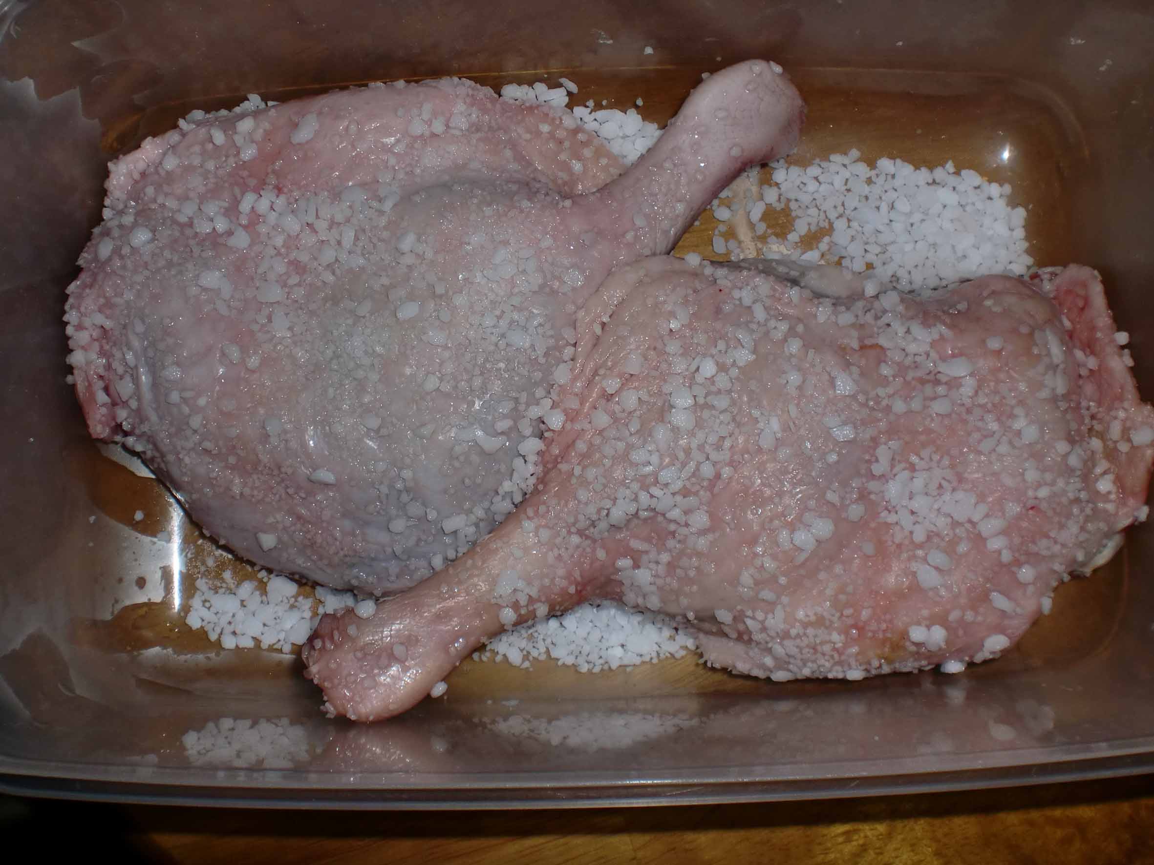Gni andelårene med en ganske generøs mengde sjøsalt/grovsalt. Plasser disse i en grunn beholder, dekk med plastikk og sett i kjøleskapet over natten.