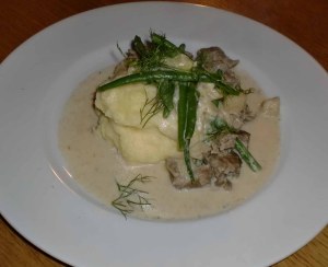 Kok kraft, vin, fløte og ceme fraiche inn til det er 6 dl væske igjen i kjelen. Kjør til slutt sausen i en kjøkkenmaskin eller hurtigmikser før den helles tilbake i kjelen (akkurat dette punktet i oppskriften hoppet jeg over, fordi jeg ikke forsto hvorfor man skal kjøre en helt jevn saus i kjøkkenmaskin). Jevn eventuelt sausen med maisenna.