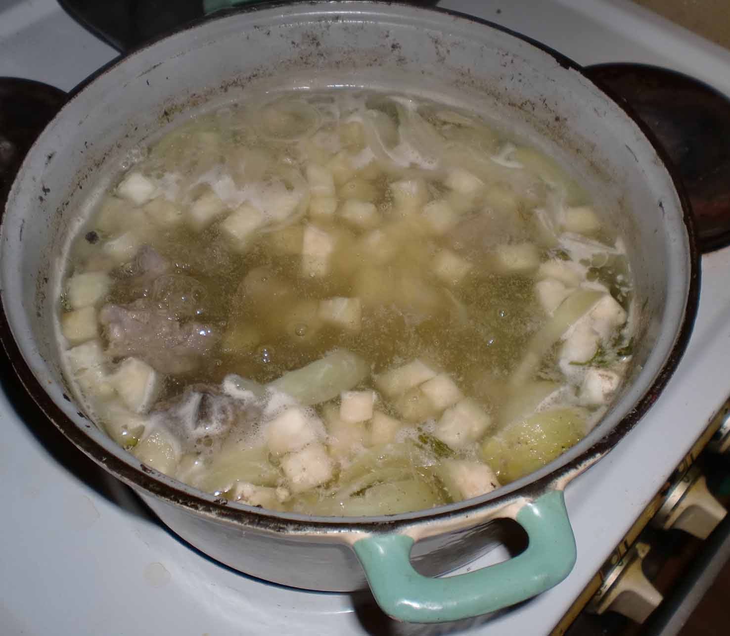Ben ut nakken og skjær kjøttet i 2 sm terninger. Legg dem i en gryte sammen med bena og dekk med vann. Kok opp og skum av det som flyter opp. Sett ned varmen.