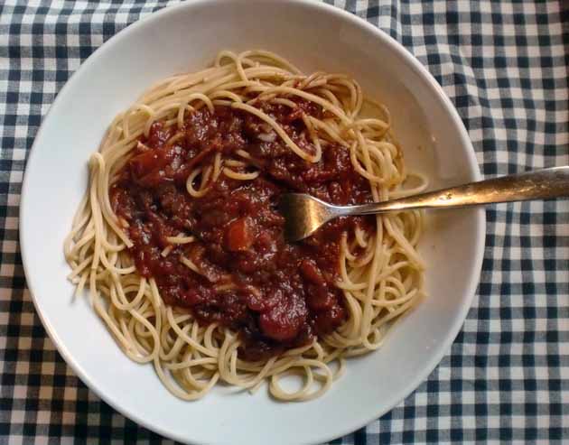 Løk, hvitløk og stangselleri hakkes i små biter og freses i 2-3 ss olje. Tilsett 2 1/2 dl rødvin og kok i 5 -10 minutter. Tilsett tomatene, hakket i biter (delt i fire om det er cherrytomater) + en boks med hakkede tomater. Tilsett 1 ss tomatpure. La det hele småputre i en time. Rør om av og til. Tilsett litt hakkede urter som for eksempel timian, basilikum og oregano helt mot slutten av koketiden. Smak til med salt og en liten klype sukker for å runde av sausen.