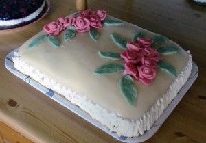 Draper marsipanen over kaken. Pynt etter hjertens lyst. NB. Ha mer enn 1 time til rådighet når du skal trille marsipanroser. Ellers kan de se litt sørgelige ut. Kremt.