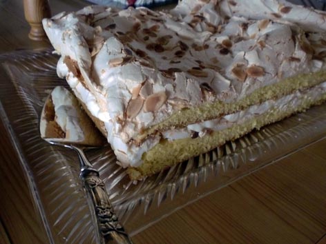Visp eggehvitene godt stive. Visp så i sukker, litt om gangen, til det blir en stiv masse. Stryk massen på toppen av kakerøren og dryss grovhakkede/skivede mandler over.