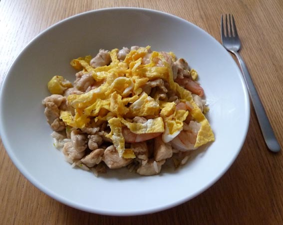 Jeg har sett krydderblandinger/ferdig ris? med samme navn, men det er jo så mye sukker og annet tull tilsatt. Interessant med strimlet omelett slik, høres jo absolutt mettende ut med egg, scampi og kylling.
