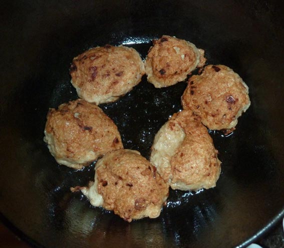 Lag fine boller med to spiseskjeer. Stek i nøytral olje i en varm jernpanne på medium varme. Et triks for å få bollene til å bli helt glatte, er å dyppe skjeene i vann.
