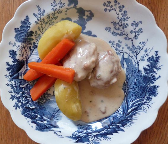 1. kok ut pannen med litt vann. Å koke ut betyr at du heller i vann og koker det opp, mens du rører i bunnen for å få med deg alle godsakene. Spe med litt melk eller mere vann, tilsett kyllingbuljong (du kan godt bruke en terning) og jevn med maisenna til passe saus. Følg instruksjonene på pakken. La bollene trekke i sausen i ca 15 minutter.