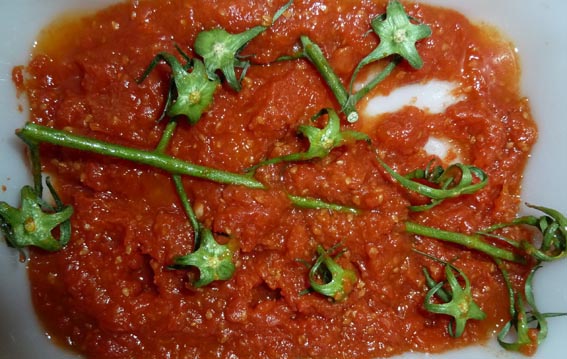 - Når sausen er avkjølt, kan du helle den over i en boks. Legg tomatstilken i boksen og sett på et lokk. Hvis sausen skal brukes straks, så lar du den stå ute i romtemperatur til den skal brukes. Grunnen til at man legger hele stilken i boksen med saus, er at den inneholder veldig mye av den friske tomatlukten. Legger man den i sausen så overføres noe av denne aromaen til sausen.