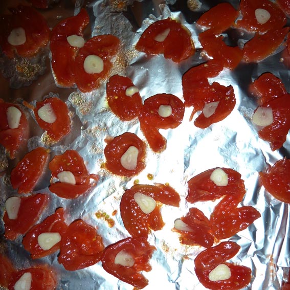 - Stek tomatene i 1-3 timer (alt etter størrelse og modenhet på tomatene), til de har blitt litt rynkete og fått en dyp rødfarge. De skal fremdeles være fuktige i motsetning til «soltørket». Hvis noen av tomatene ser ut til å bli ferdig før de andre, fjern de fra brettet. Halvveis i stekeprosessen skal du snu tomatene.