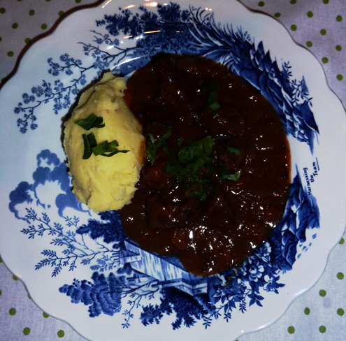 Hjortegryte med rødvin, eplesider og tørkede aprikoser