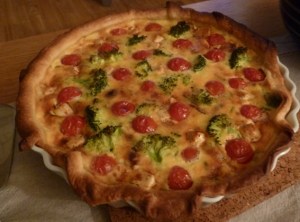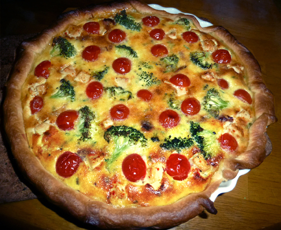 Fordel dette i det forstekte paiskallet. Hell over eggestanden. Fordel brokkolibuketter, tomater og fetaost i paien.