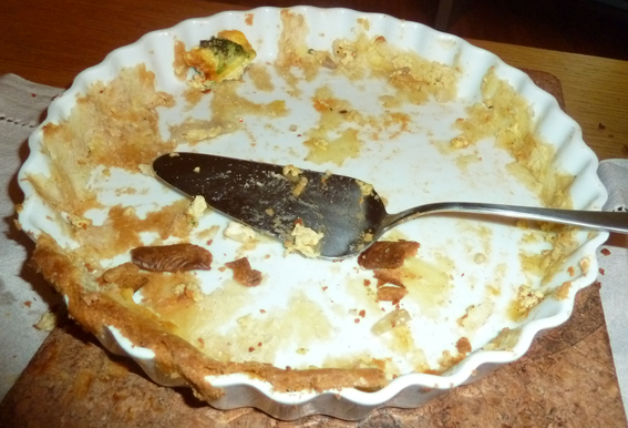 Stekes på 180 grader midt i ovnen i 20-30 minutter. Sjekk etter tyve minutter. Paien er ferdig når skallet er gyldent og fyllet har stivnet.
