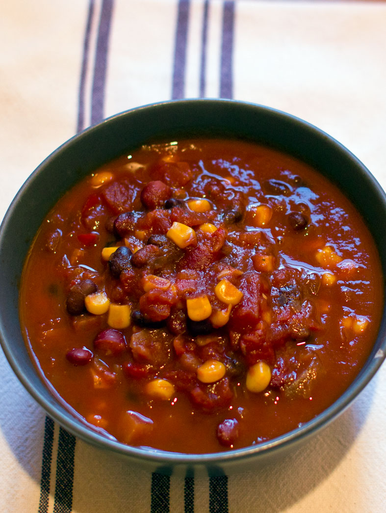 Ha så i bønner, paprika, gulrot, paprika, chipotle chilier, buljongpulver og tomater. Tilsett vann til passe tykk konsistens (jeg brukte 3 dl, men begynn med 2). La det småkoke under lokk i 15-20 minutter, til grønnsakene er ferdigkokte. Hvis du velger å bruke tørre, bløtlagte bønner, må du regne med 1 1/2 times koketid. Rør helt til slutt inn maiskornene.