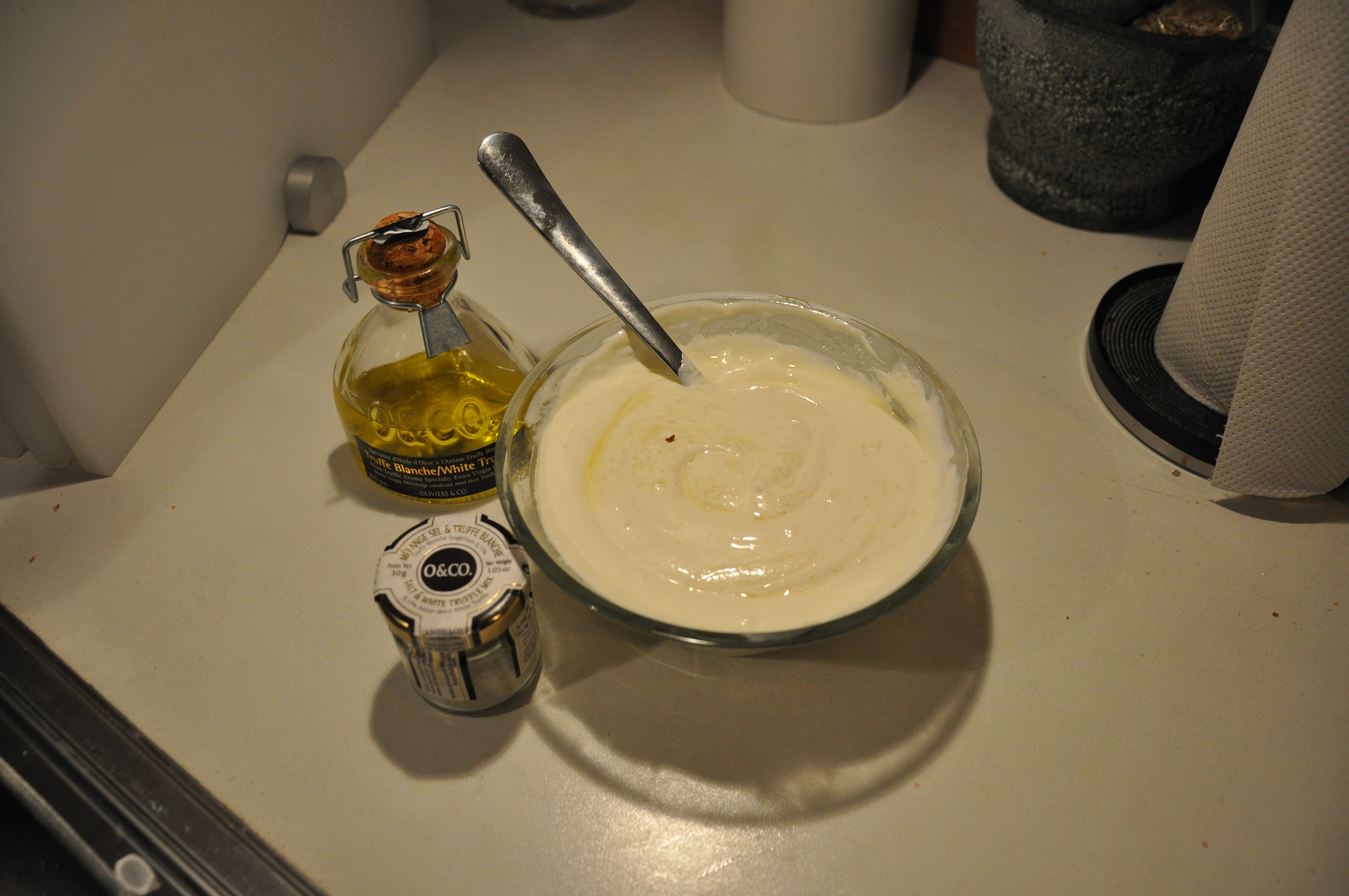 Denne dippen er en synd i seg selv, men måten jeg bruker den på er kanskje enda mer syndig. Trøffler er en sann naturens gave; denne velsmakende, men noe illeluktende soppen som spores opp av kyndige griser eller hunder, og graves forsiktig opp har en kilopris som på god vei konkurrerer med de edleste metaller, men jeg bruker den altså (blant annet) i dip til chips! Det er vel kanskje en av de tingene vårt velstandssamfunn tillater.