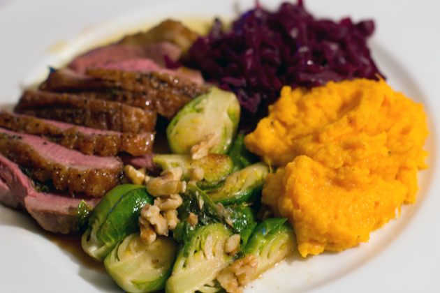 I oppskriften står det at det skal være nok med to andebryst på fire personer. Dette er ikke til å spise seg mett på, så jeg ville ha beregnet mer and om det skal være eneste rett. Jeg har også lagt til litt mer tilbehør i form av rosenkål og en søtpotetmos. Min venninne Ragnhild serverte meg denne retten første gang og jeg ble helfrelst.
