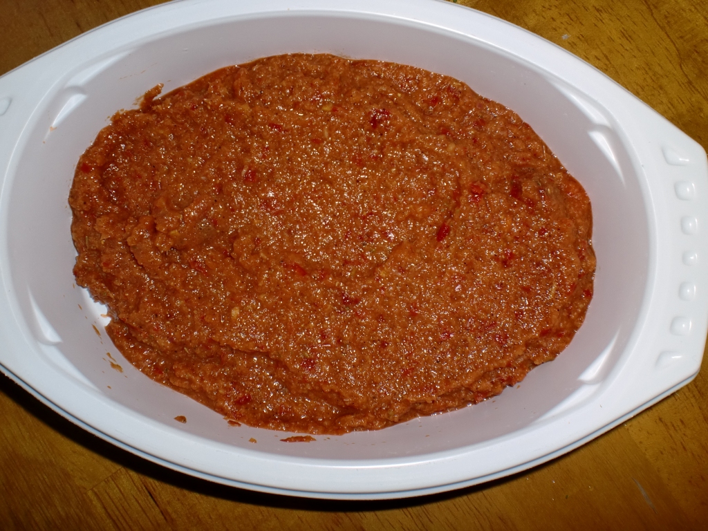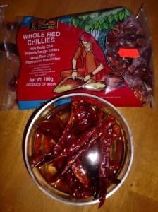16 små tørkede  chilier (jeg brukte 16 store chilier og spedde på med et par tørkede piripirier, da det var det jeg hadde).