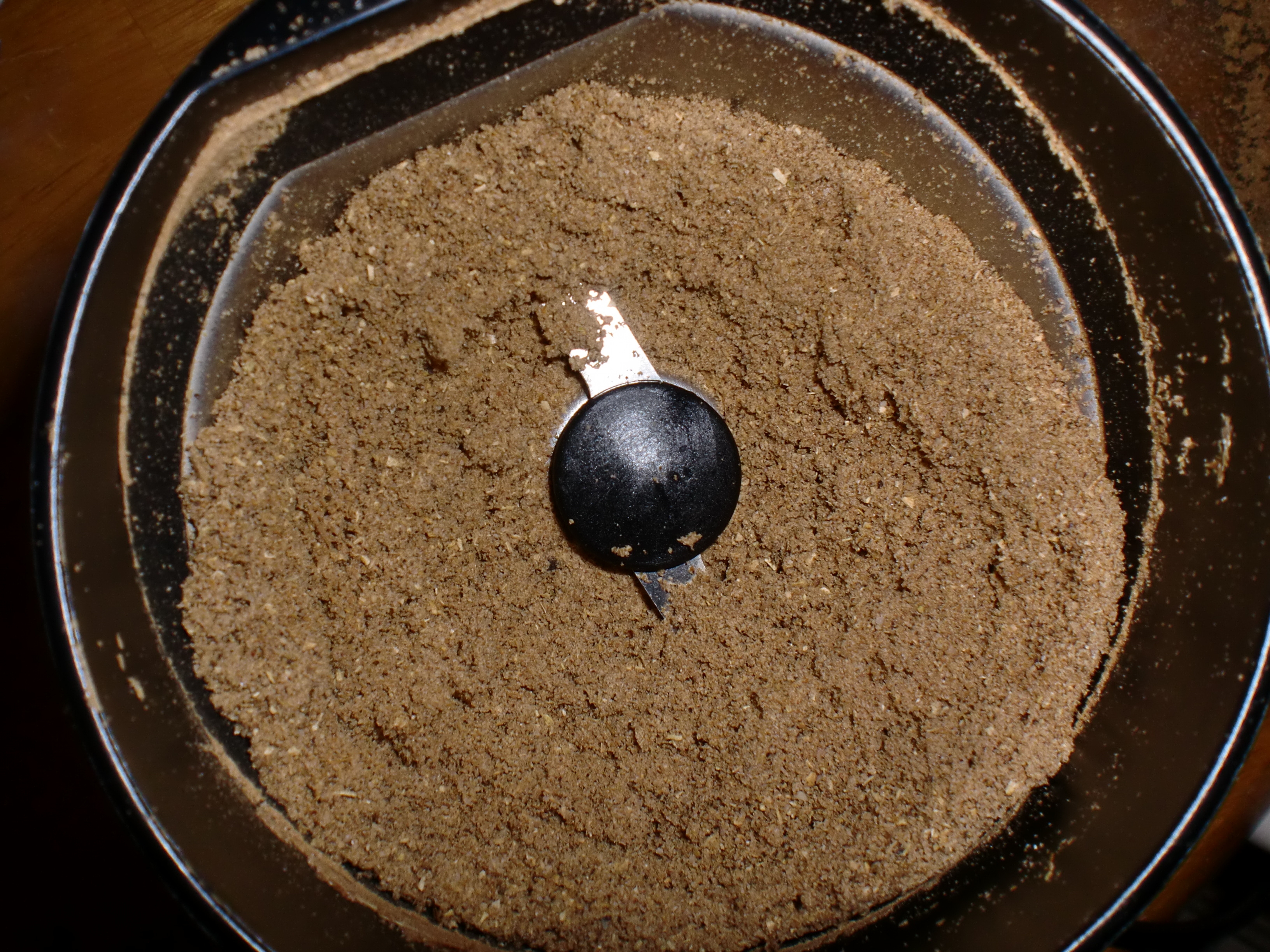 Nå kan du enten finne frem mortel og pestel og knuse de til fint pulver med mye møye, eller så kan du bruke en elektriske kaffekvern. Jeg har en fra Bosch som jeg aldri har brukt til kaffe, og som passer til dette formålet.
